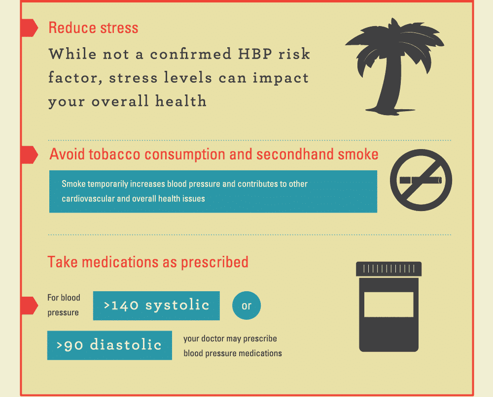 - Reduce Stress: High stress levels may have a negative impact on your overall health, including you blood pressure, so try avoiding very stressful situations and/or practice stress management techniques.