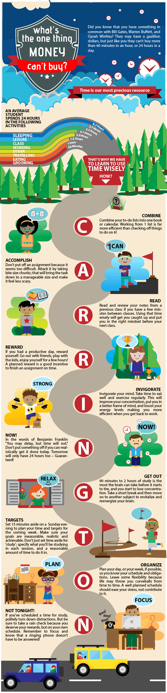 Carrington College Time Saving Tips Via Carrington College Did you know that you have something in common with Bill Gates, Warren Buffett, and Oprah Winfrey? They may have a gazillion dollars, but just like you they can’t buy more than 60 minutes in an hour, or 24 hours in a day. So that’s why we all have to learn to use time wisely. Time is our most precious resource. You don’t have an entourage or assistants to help you through your day, so we know that you are under huge time pressure. Not only do you have to find the time for class and study, but you also may have to work a job, maybe two, plus you have family commitments and friends to manage. With that in mind, read these 10 CARRINGTON time saving hints and tips…they may help you become more productive. C – Combine your to-do lists into one book or calendar. Working from 1 list is far more efficient than checking off things to do on 6! A – Accomplish. Don’t put off an assignment because it seems too difficult. Attack it by taking bite size chunks; that will bring the task down to a manageable size and make it feel less scary. R – Read and review your notes from a previous class if you have a few minutes between classes. Using that time wisely will get you caught up and put you in the right mindset before your next class. R – Reward. If you had a productive day, reward yourself. Go out with friends, play with the kids, enjoy yourself for a few hours!  A planned reward is a good incentive to finish an assignment on time. I – Invigorate your mindTake time to eat well and exercise regularly. This will improve your concentration, put you in a better frame of mind, and boost your energy levels making you more efficient when you get back to work. N – Now!  In the words of Benjamin Franklin – “You may delay, but time will not.”  Don’t put something off if you can realistically get it done today. Tomorrow will only have 24 hours too – Guaranteed! G  Get Out. 90 minutes to 2 hours of study is the most the brain can take before it starts to tire, and you start to lose concentration. Take a short break, grab 15 minutes of fresh air if you can, and then move on to another subject to revitalize and reenergize your brain. T – Targets. Set 15 minutes aside on a Sunday evening to plan your time and targets for the coming week. Make sure your goals are measurable, realistic and achievable. Don’t just set time aside for ‘study’; specify what you’ll be studying in each session, and a reasonable amount of time to do it in. O – Organize. Plan your day, or your week, if possible, so you know your schedule and obligations. Leave some flexibility because life may throw you curveballs from time to time. A well planned schedule should ease your stress, not contribute to it. N – Not Tonight!  If you’ve scheduled a time for study, politely turn down distractions. But be sure to take a rain check because you deserve your rewards…but on your own schedule. Remember to focus… and know that a ringing phone doesn’t have to be answered!