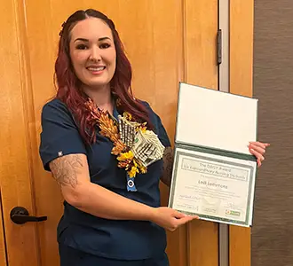 Sabina Grimes was nominated for the DAISY Award for Nursing Students this March by Kimberly Marcus, a Pediatric, Critical Care nurse at Renown Regional Medical Center. She was nominated because of her outstanding patient care, and her spirit of inquiry on a clinical day during her Pediatric rotation at the hospital.